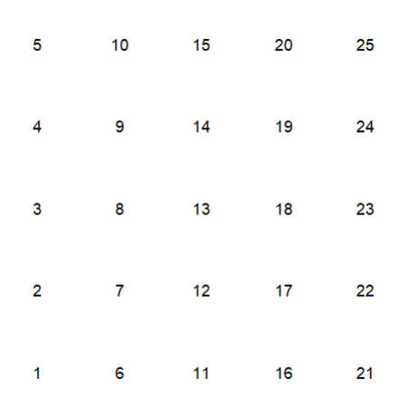 # [3,] 3 8 13 18 23